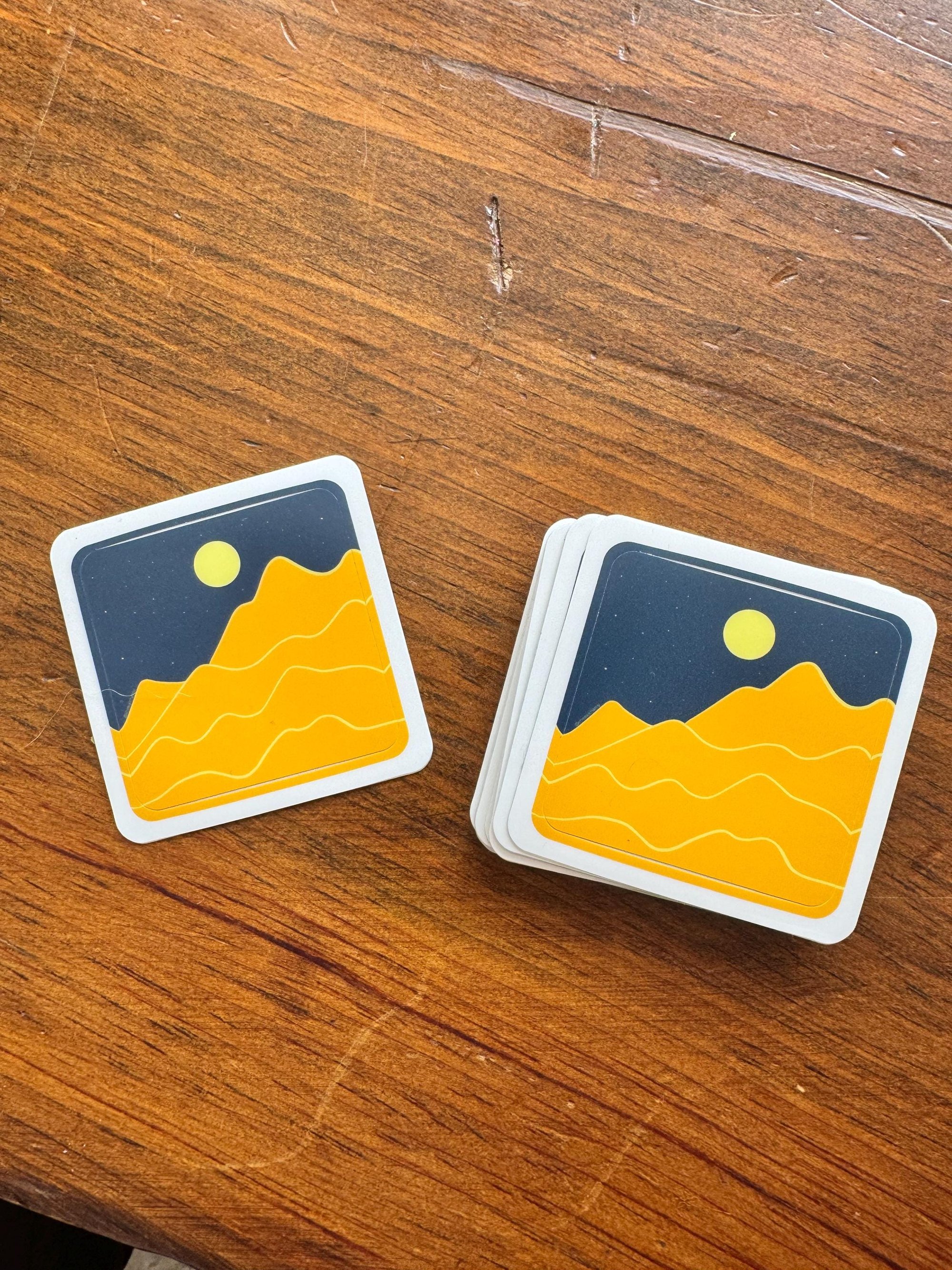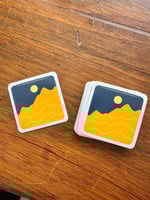 Bring a touch of celestial beauty to your everyday items with this 2" eco-friendly, waterproof sticker. Featuring a beautiful illustration of golden mountain ranges under a starry sky and glowing moon, this design captures the serene beauty of nature and the night sky. Whether you’re adding it to your laptop, water bottle, or journal, this sticker will remind you of the wonder and magic of the great outdoors.