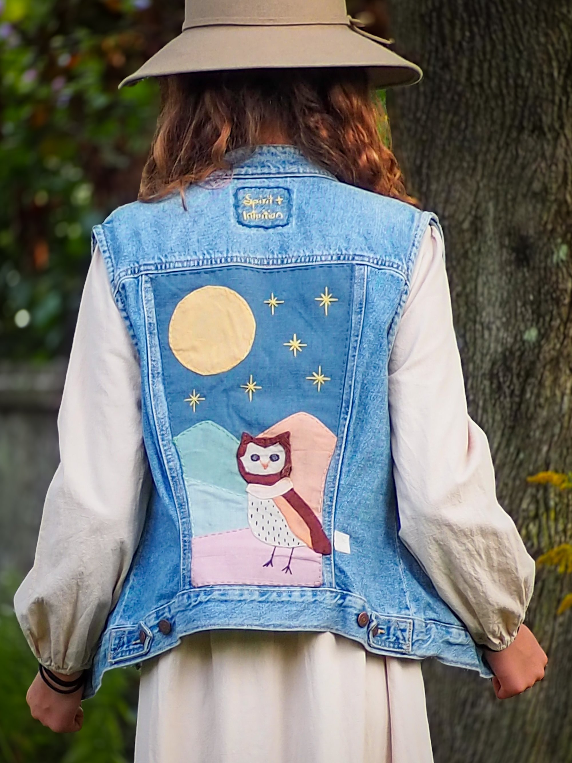 Night Owl Hand Appliquéd Levi’s Denim Vest is a one of a kind reclaimed denim vest. Hand sewn and loving visibly repaired for Spirit and Intention - the gifts of magic that owls bring. The Night Owl will be your guide with its many abilities. They have an ability to see in the dark that makes them a powerful guides. Owls are said to be protective birds that bring insight, healing and wisdom from their connections and travels to other realms.