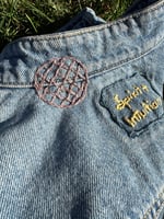This denim vest has been reclaimed and isn't new. It's been thrifted and given a new life instead of ending up as waste in a landfill. All art work has been added and hand sewn with reclaimed and up-cycled fabric. Many hours of design and hand stitched intention have been put into this vest to transform it into a sustainable work of wearable art and magic.